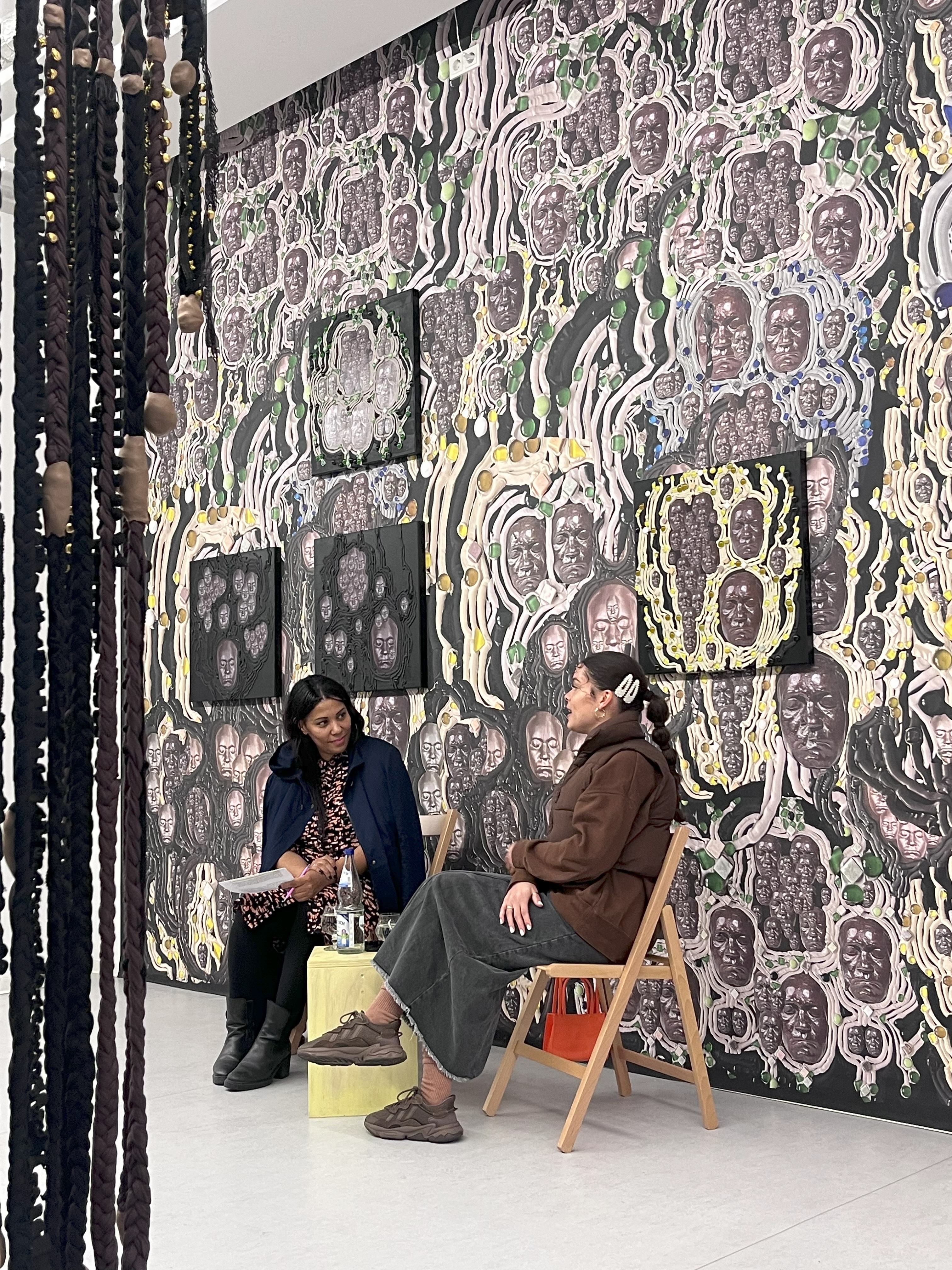 Am Samstag, den 14. September 2024, findet im Rahmen des Programms der Berlin Art Week die Performance Die 9. Sinfonie und die Dichte des Waldes statt. Theresa Weber arbeitet immer wieder kollaborativ und insbesondere bei ihren Performances mit wiederkehrenden Kollaborationspartner*innen zusammen. Für die Ausstellung Alle Menschen werden Brüder im Projektraum Neun Kelche kooperiert sie erneut mit dem afrodeutschen Soundkünstler Nathanael Amadou Kliebhan. Im Fokus der Performance stehen die kostümartigen textilen Skulpturen Webers oder Woven Bodies, die von weiteren Performer*innen aktiviert werden. Die Woven Bodies können als Körpererweiterungen gesehen werden und hinterfragen, was dem kulturellen Körper Bedeutung verleiht. Sie verbinden das Individuum mit einem Netzwerk aus Vergangenheit und Gegenwart, aus Vorfahren und Mitmenschen. Im Anschluss folgt eine performative Lesung der Künstlerin, die über ihre poetischen Texte weitere Zugänge zu ihrer künstlerischen Recherche zu Afro-Deutscher Geschichte und "White-Passing" eröffnet.